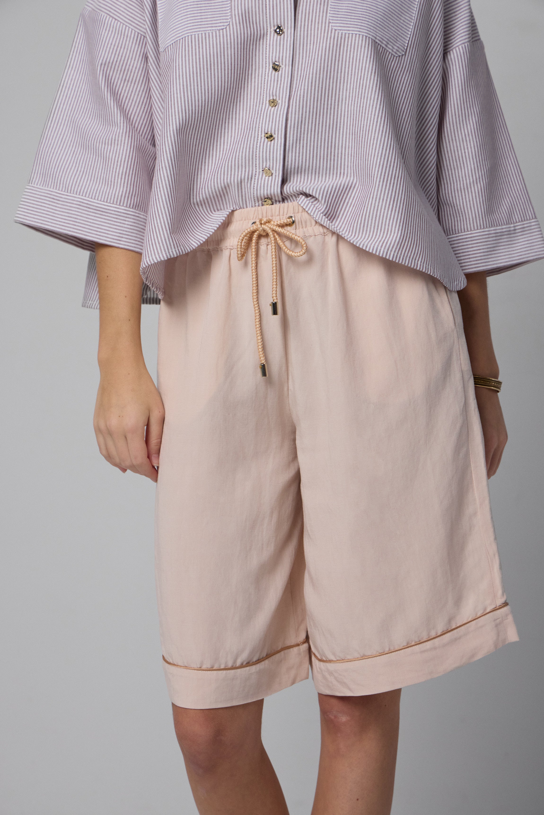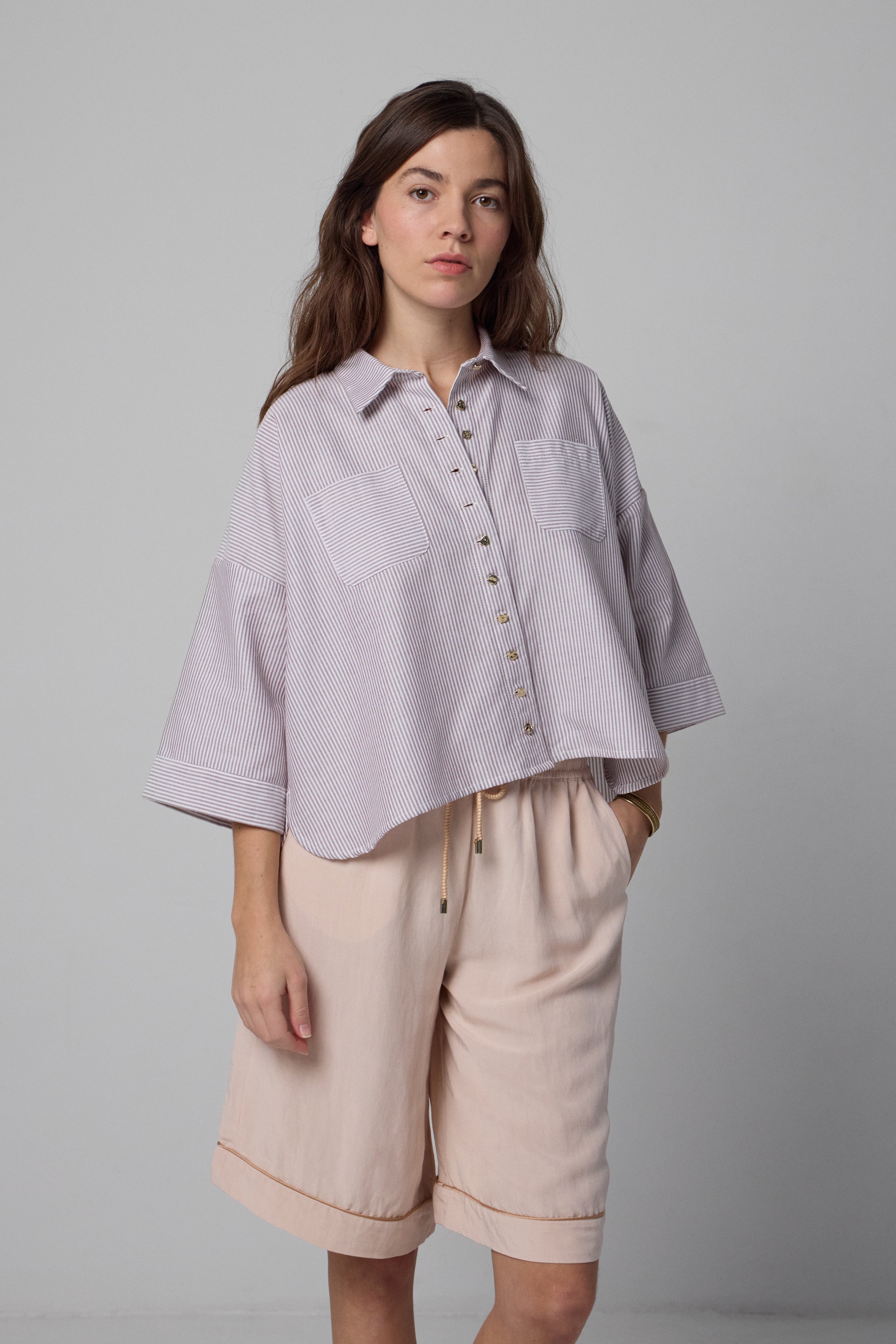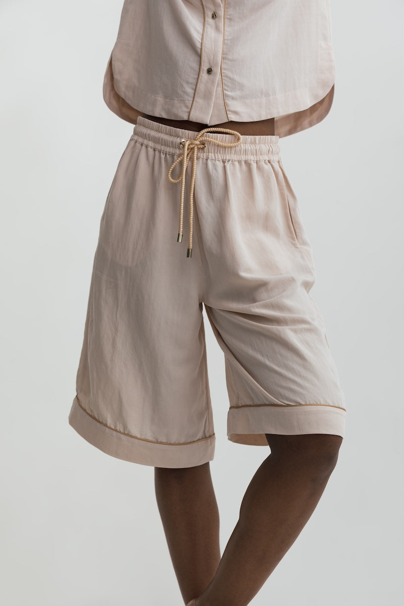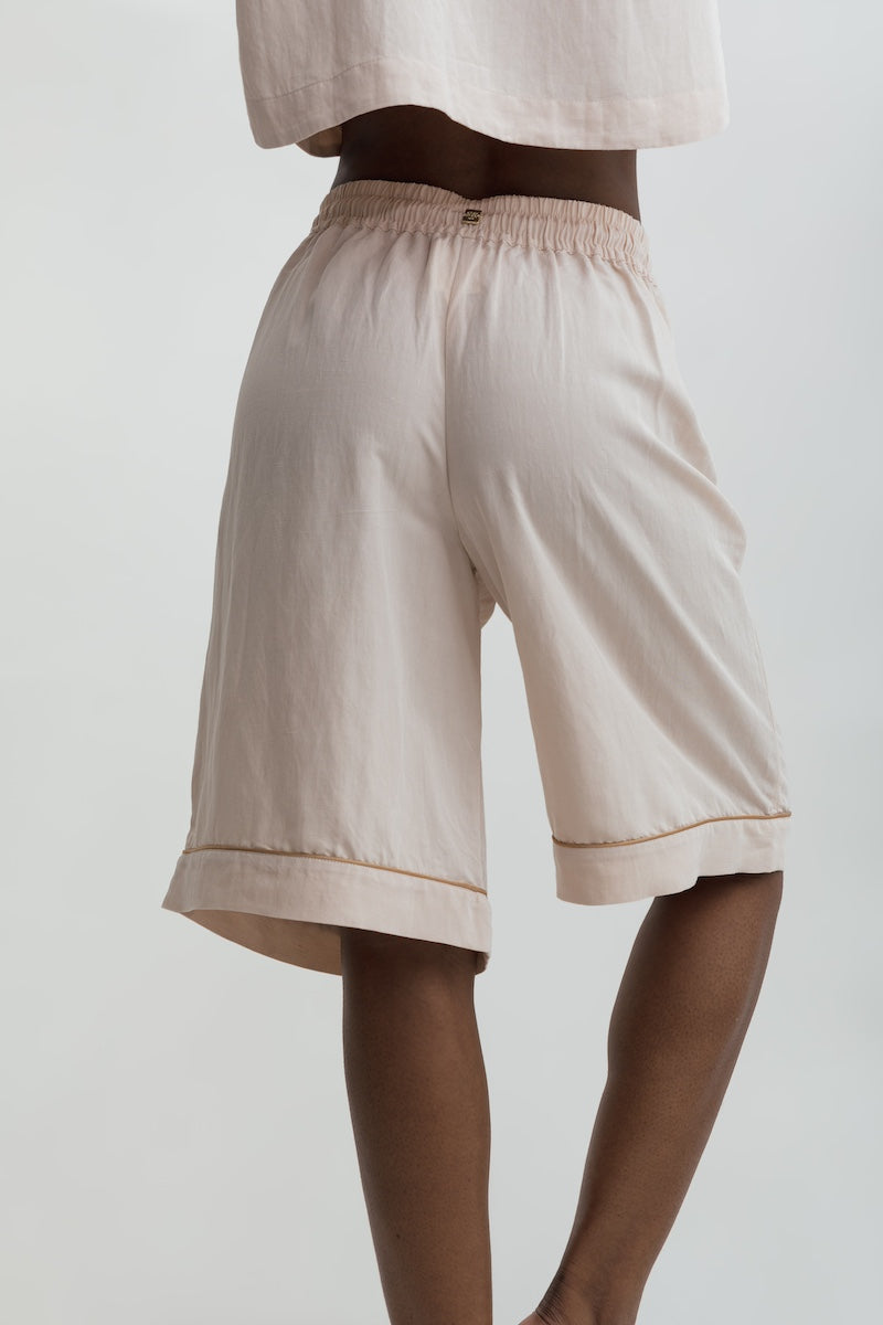 Le bermuda Belma a une longueur qui s’arrête juste au dessus du genou. Il a deux poches et peut vous accompagner durant vos journées comme dans vos soirées. Sa taille est élastique et réglable par des cordons. De légères surpiqures rajoutent du détail sur le bas. Il pourra être associé à notre chemisette Billie ou au kimono Brigitte.