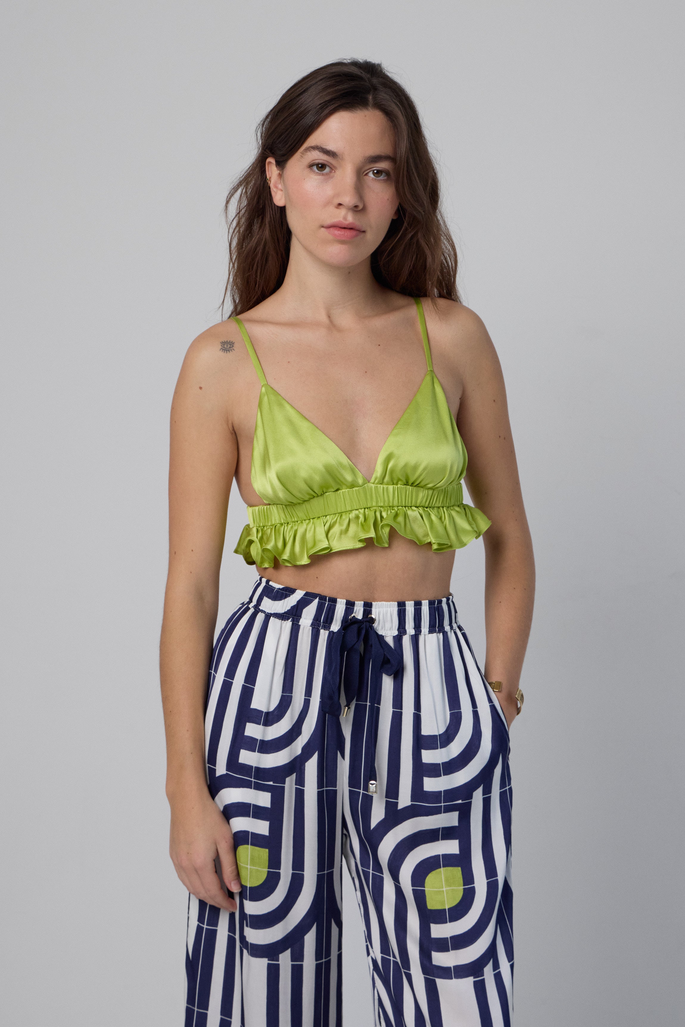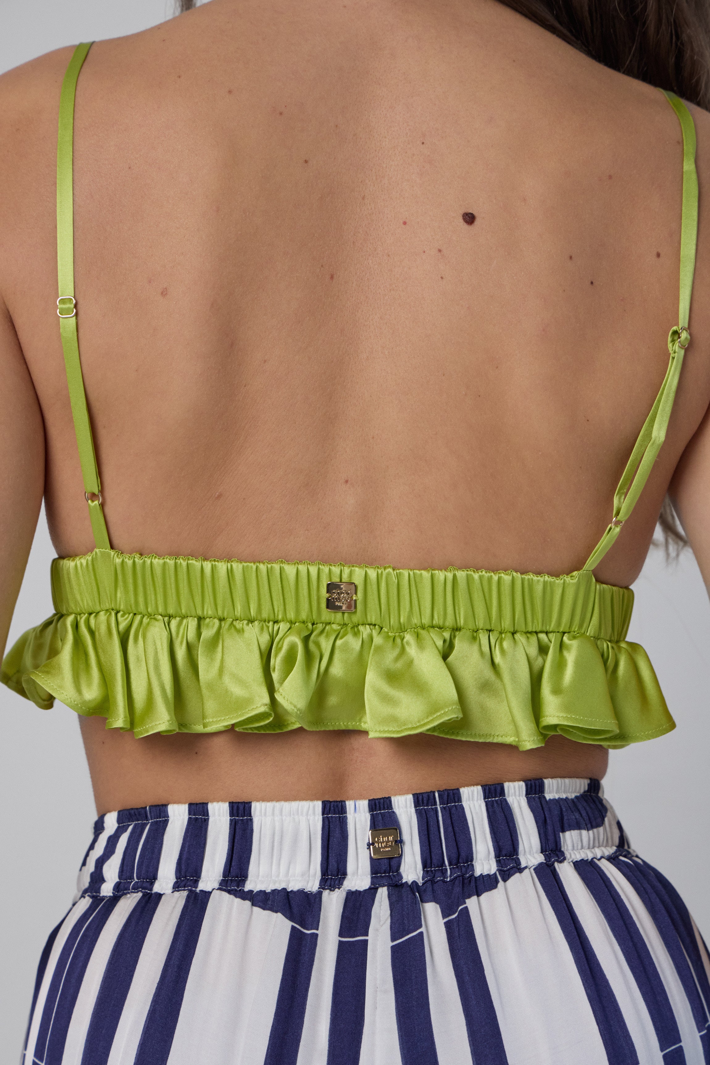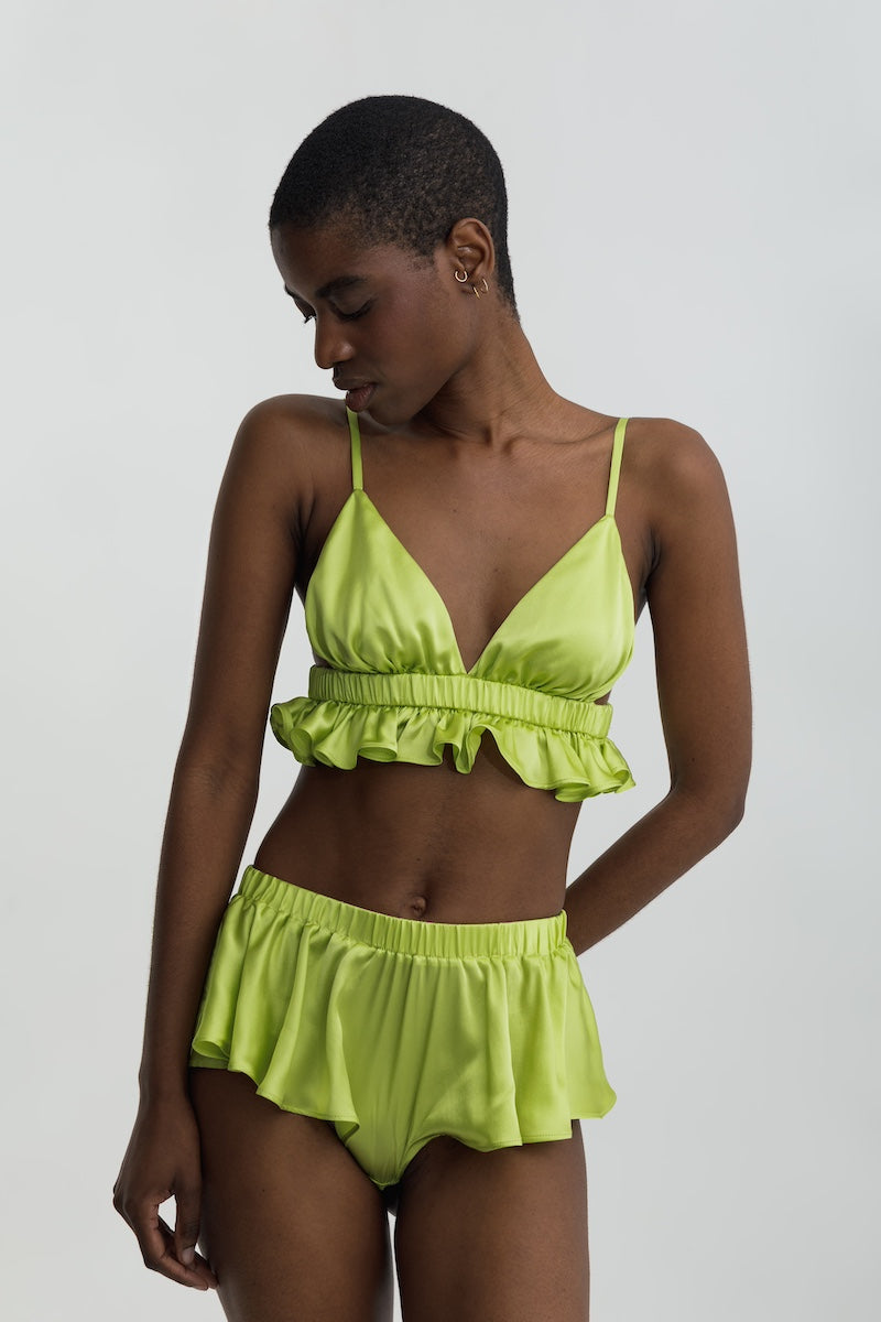 流れるようなサテンの三角形のブラレット。伸縮性のあるアンダーバストにフリルがあしらわれています。T シャツのようにさっと着ることができ、ストラップは調節可能で、ぴったりフィットします。 Bety ランジェリー トップには、Charmée Paris の刻印が入ったゴールドのメタル プレートも付いています。 Beth のパンティーと簡単に組み合わせて、シックなセットを作ることができます。