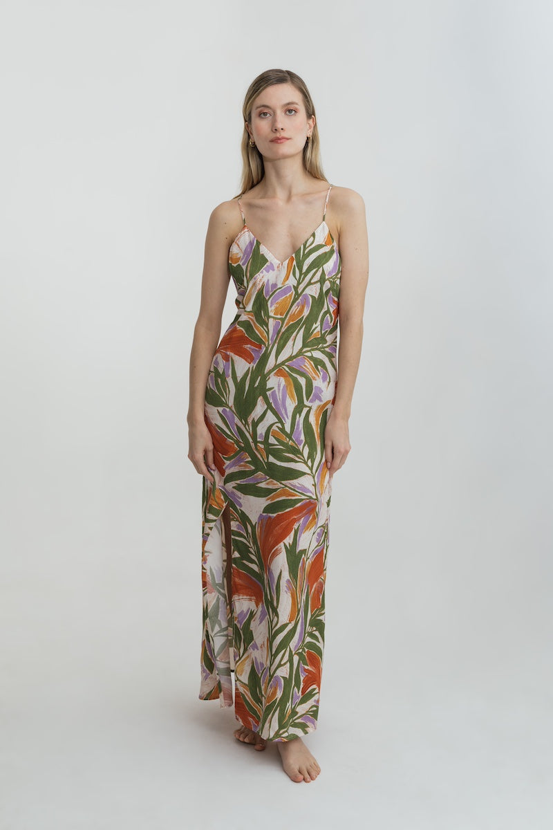 La robe longue Betsy comporte une fente sur le côté droit, apportant fluidité dans les mouvements et dévoilant subtilement votre jambe. Cette pièce se règle à l'aide de bretelles ajustables croisées dans le dos, pour un rendu délicatement sensuel. Ce modèle dispose également d'une plaque en métal doré au dos, estampillée Charmée Paris.